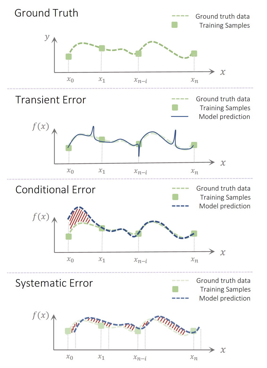 Transient errors cause sudden shifts in the accuracy of the neural network. Conditional errors will cause the deep learning model to deviate from the ground truth in specific areas. And systemic errors create domain-wide shifts in the accuracy of the model. All three types of errors can cause safety risks.
