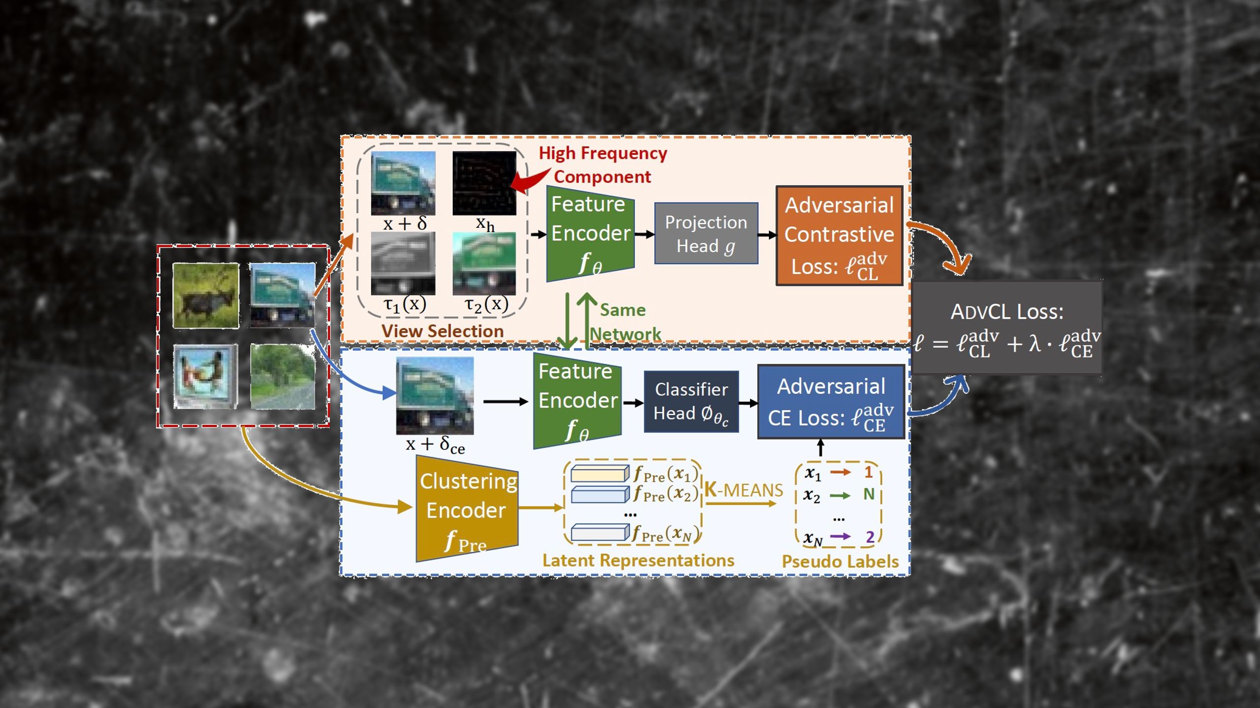 AdvCL uses the standard contrastive view generation mechanism and adds two new elements: an adversarial view and a high-frequency view. The adversarial perturbations are generated using a novel technique that has been tailored for contrastive learning. The high-frequency component (HFC) extracts the parts of the image that are relevant to feature generalization and are more vulnerable to adversarial perturbations. As opposed to the standard CL, which trains the machine learning model on two views, AdvCL optimizes the model for a four-view contrastive loss.