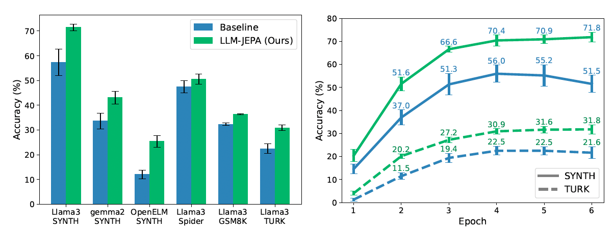 The researchers tested LLM-JEPA by fine-tuning and pretraining several models, including those from the Llama3, Gemma2, OpenELM, and Olmo families, on datasets like NL-RX, GSM8K, and Spider. The experiments showed that the LLM-JEPA training method consistently improved performance in both finetuning and pretraining scenarios. The authors state that their proposed method “maintains the generative capabilities of LLMs while improving their abstract prompt representation as empirically validated across datasets and models.”