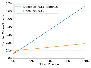 In contrast, DSA uses a “lightning indexer” that determines which of the previous tokens are important for the current token to attend to. This mechanism ensures that while the model benefits from efficiency gains, it minimizes accuracy loss. DSA practically turns attention from a quadratic problem to a linear one. In comparison to DeepSeek-V3.1 Terminus, an earlier model that didn’t use DSA, DeepSeek-V3.2 reduces the costs of attention considerably, and the difference becomes even larger as the sequence becomes longer.