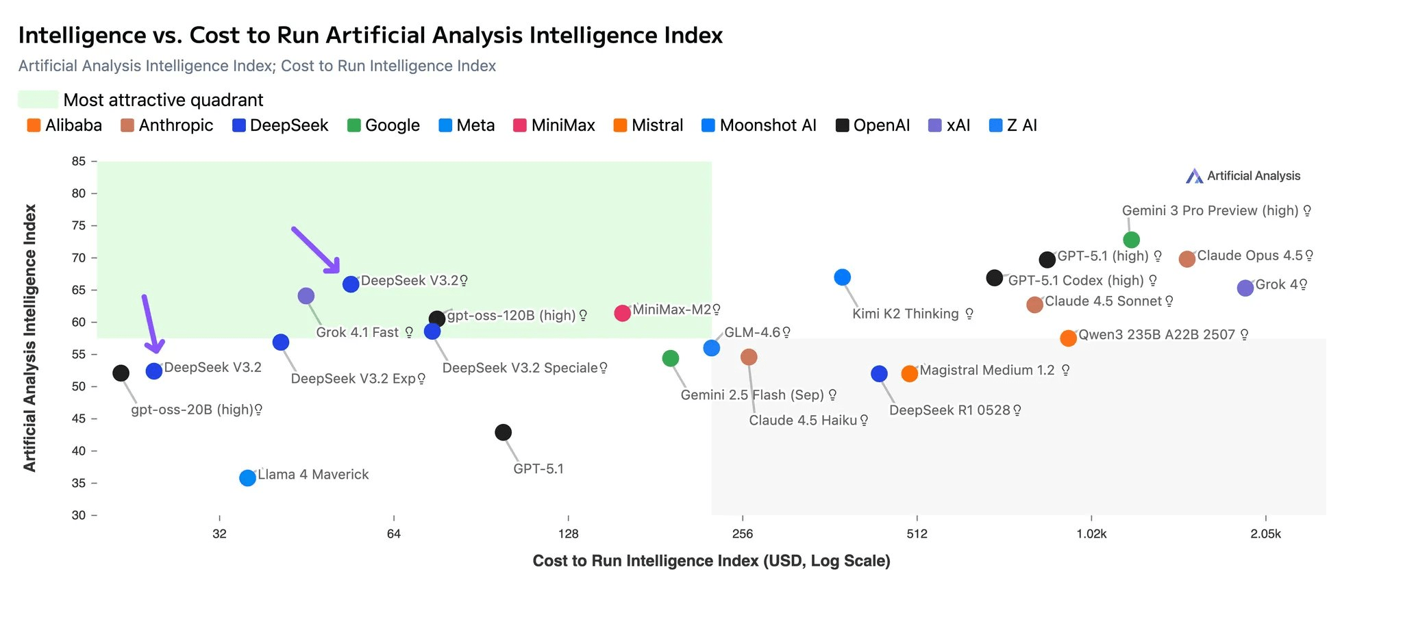 But as impressive as the performance of the model is its cost-effectiveness. DeepSeek-V3.2 costs $0.28 per million input tokens and $0.48 per million output tokens. It is also more efficient on token usage than it predecessors ($54 for running the Artificial Analysis tests in comparison to $380 for DeepSeek-R1 0528) as well as other competing models ($380 for Kimi K2 Thinking, $859 for GPT-5.1 High, and $1,201 for Gemini 3 Pro). It stands out on the Pareto curve of cost/intelligence among both open and closed models.
